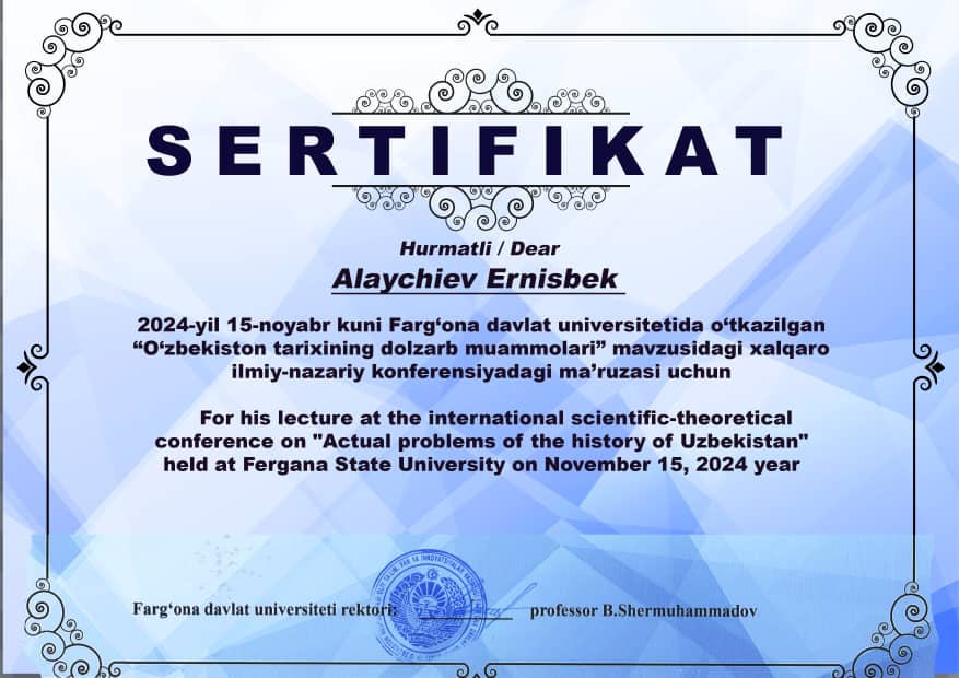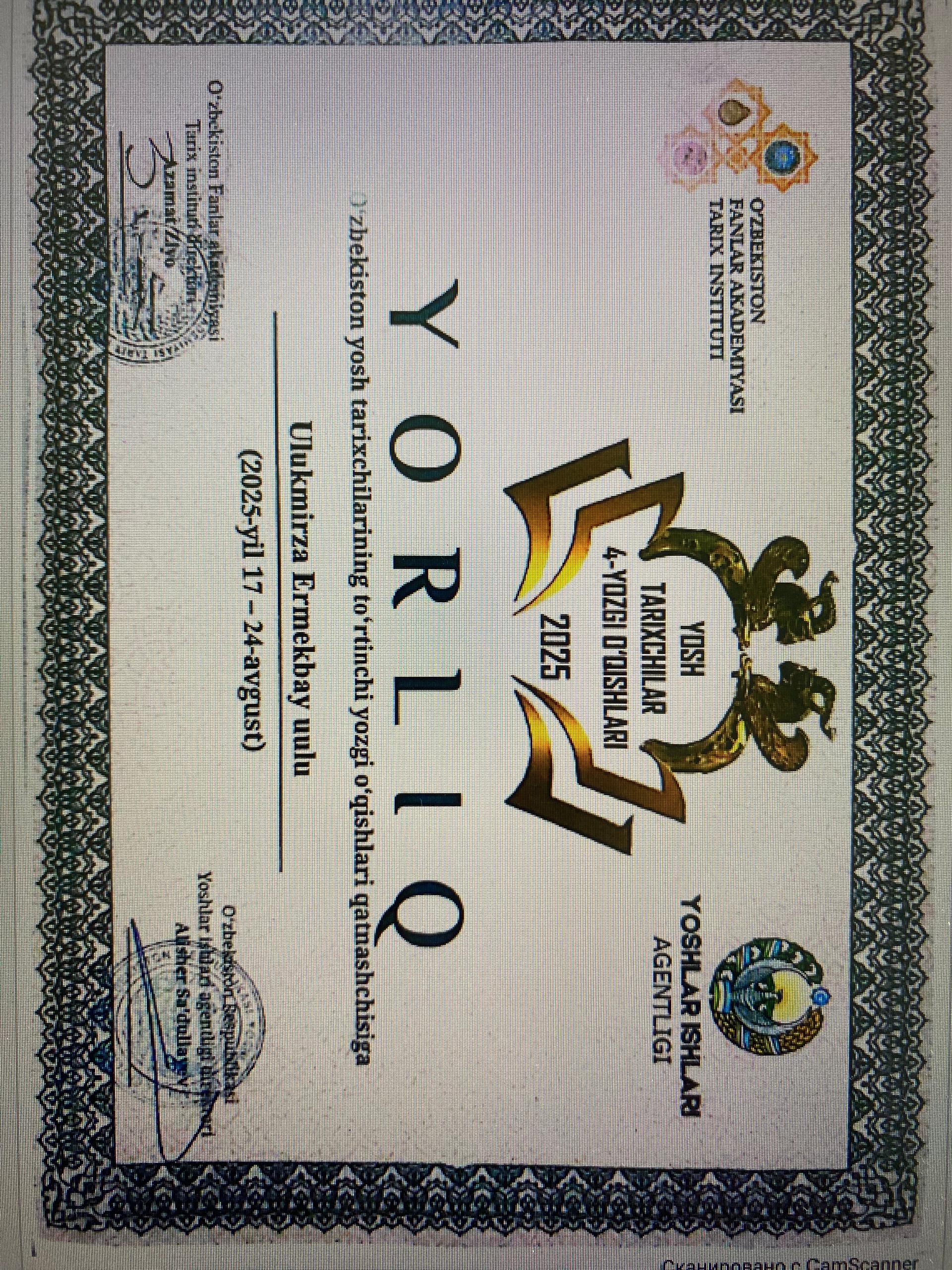 | 17 | Изилдөө тема боюнча тарыхчы жана этнографтардын жазгы мектебине катышуу | IV Эл аралык жаш тарыхчылардын жайкы мектеби | 2025-08-24  2025-08-25  |