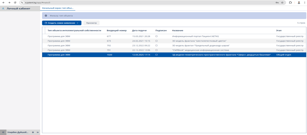 | 4 | Геометриялык фракталдардын жаңы түрлөрүн табуу жана 3D моделдерин алуу үчүн компьютердик программаларды иштеп чыгуу. | Макалаларды жана тезистерди даярдоо жана басмага жөнөтүү. Мейкиндик фракталдардын 3D моделдерин алуу үчүн компьютердик программаларды иштеп чыгуу | 2025-01-14 0000-00-00 |