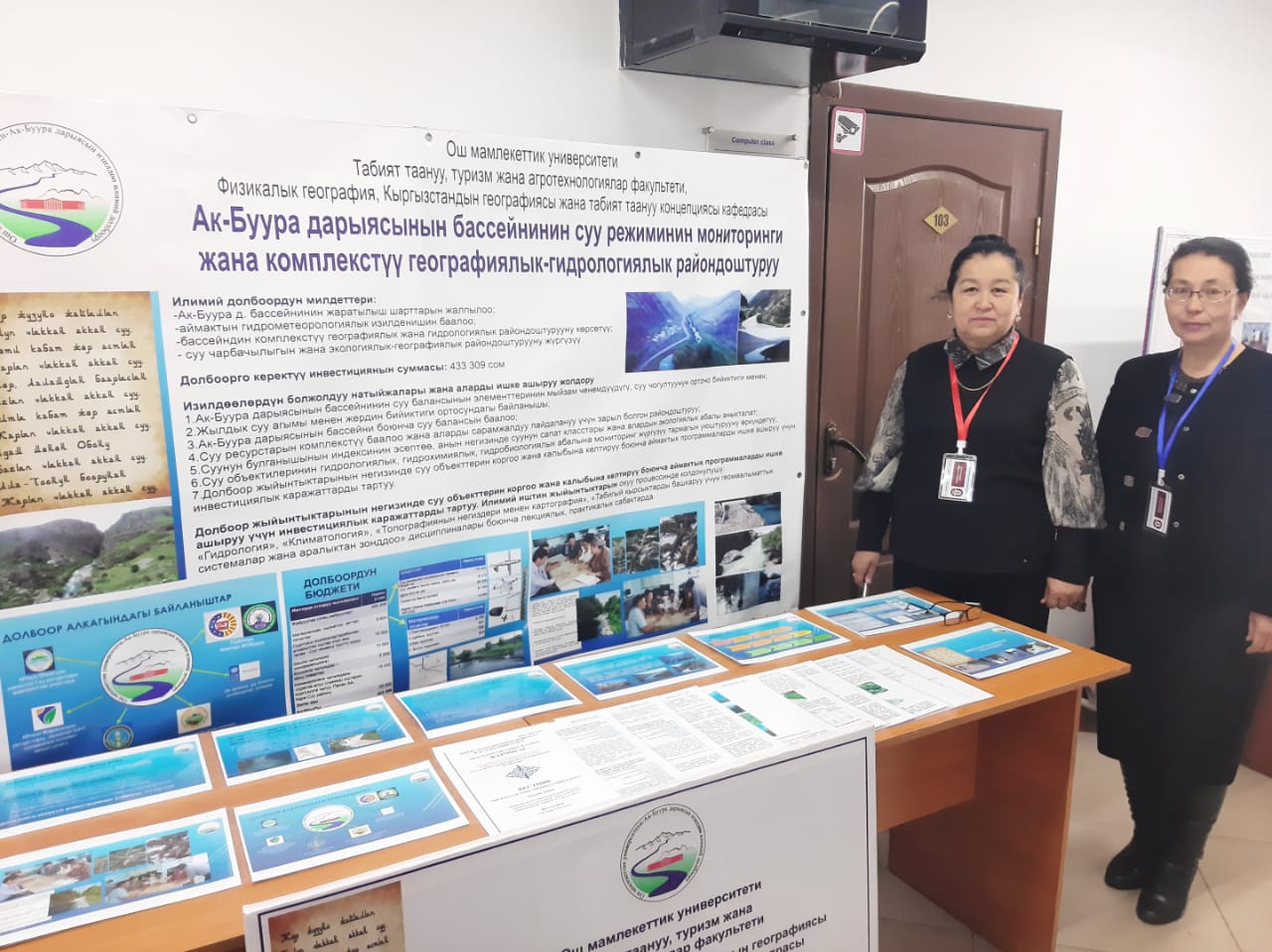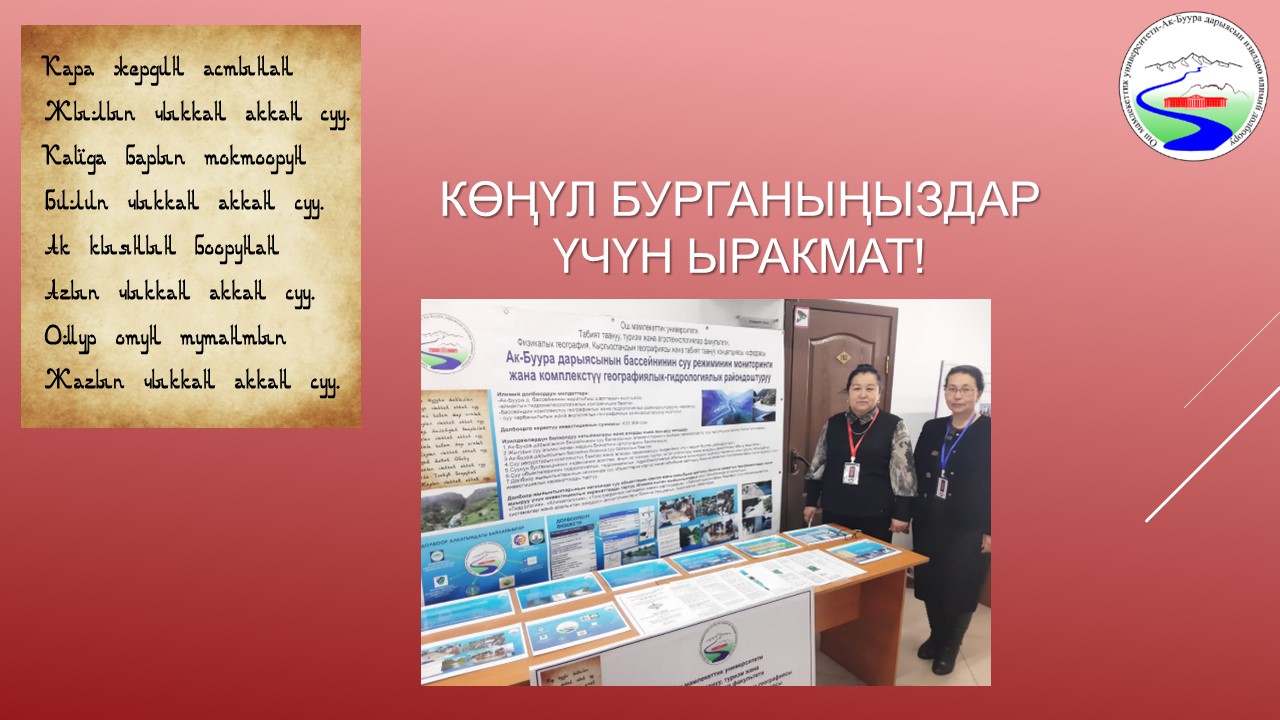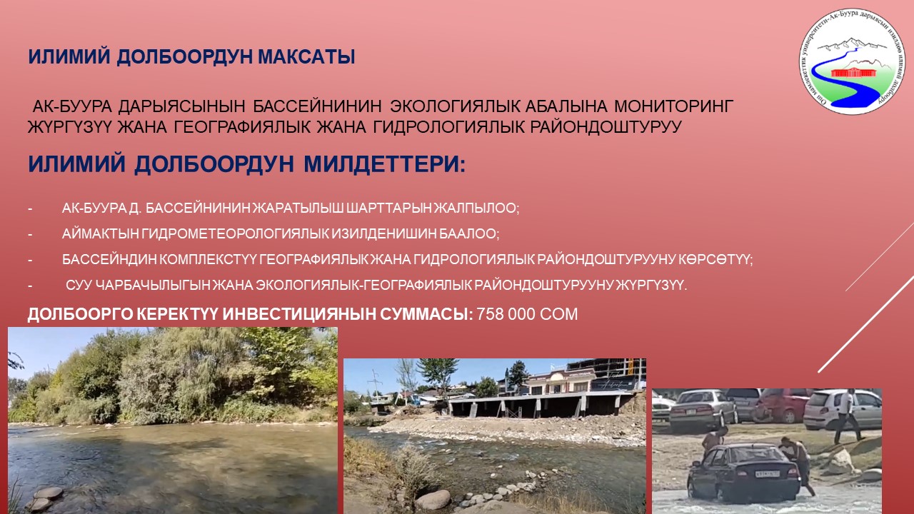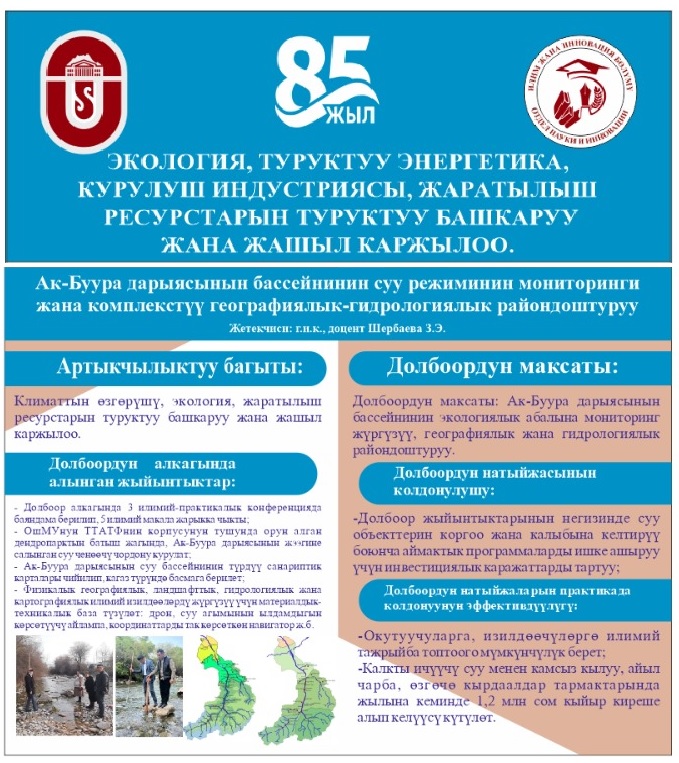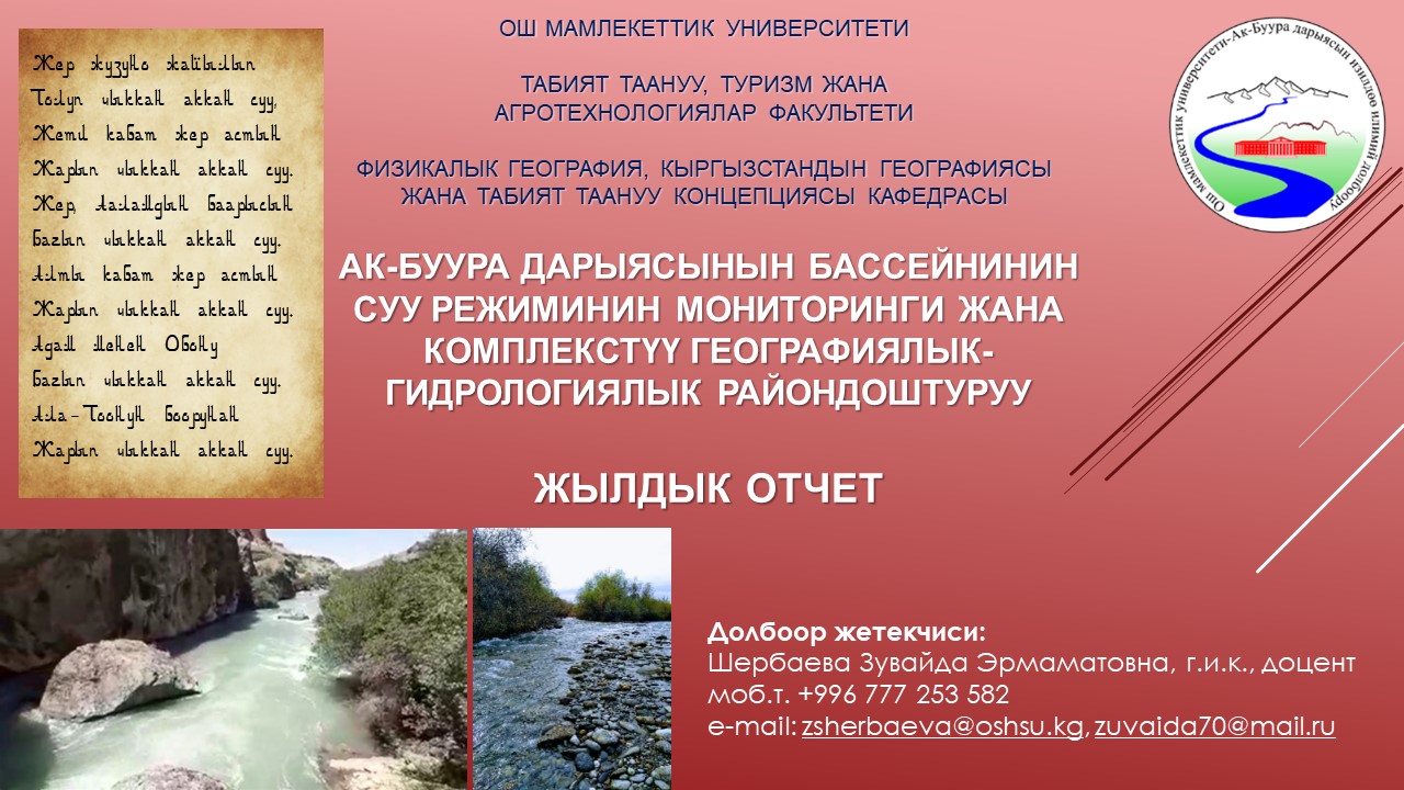 ОшМУ, ТТАТФ | Алынуучу жыйынтык: а) ОшМУнун ТТАТФнин корпусун тушунда орун алган дендропарктын батыш жагында, Ак-Буура дарыясынын жээгине салынган суу ченөөчү чордону курулат. б) Ак-Буура дарыясынын суу бассейнинин түрдүү санариптик карталары чийилип, кагаз түрүндө басмага берилет. в) Долбоор алкагында 3 илимий-практикалык конференцияда баяндама берилип, 5 илимий макала жарыкка чыкты. г) Физикалык географиялык, ландшафттык, гидрологиялык жана картографиялык илимий изилдөөлөрдү жүргүзүү үчүн материалдык-техникалык база түзүлөт: дрон, суу агымынын ылдамдыгын көрсөтүүчү айлампа, координаталарды так көрсөткөн навигатор, ж.б. жабдуулар алынат. Практикалык мааниси: 1) Суу ченөөчү чордону жылдын ар кайсы мезгилиндеги суунун деңгээлинин жана агым ылдамдыгынын сандык көрсөткүчтөрүн ыкчам алууга мүмкүнчүлүк берүүсү түрдүү илимий-практикалык талдоолорду жана билим берүү-педагогикалык иштерди жүргүзүүгө өбөлгө түзөт; 2) Калкты ичүүчү суу менен камсыз кылуу, айыл чарба, өзгөчө кырдаалдар тармактарында жылына кеминде 1,2 млн. сом кыйыр киреше алып келет; 3) Илимий тажрыйба топтогонго мүмкүнчүлүк берет. |