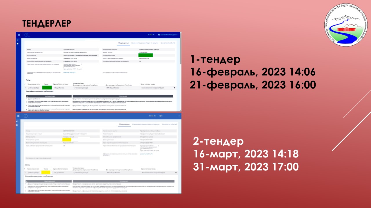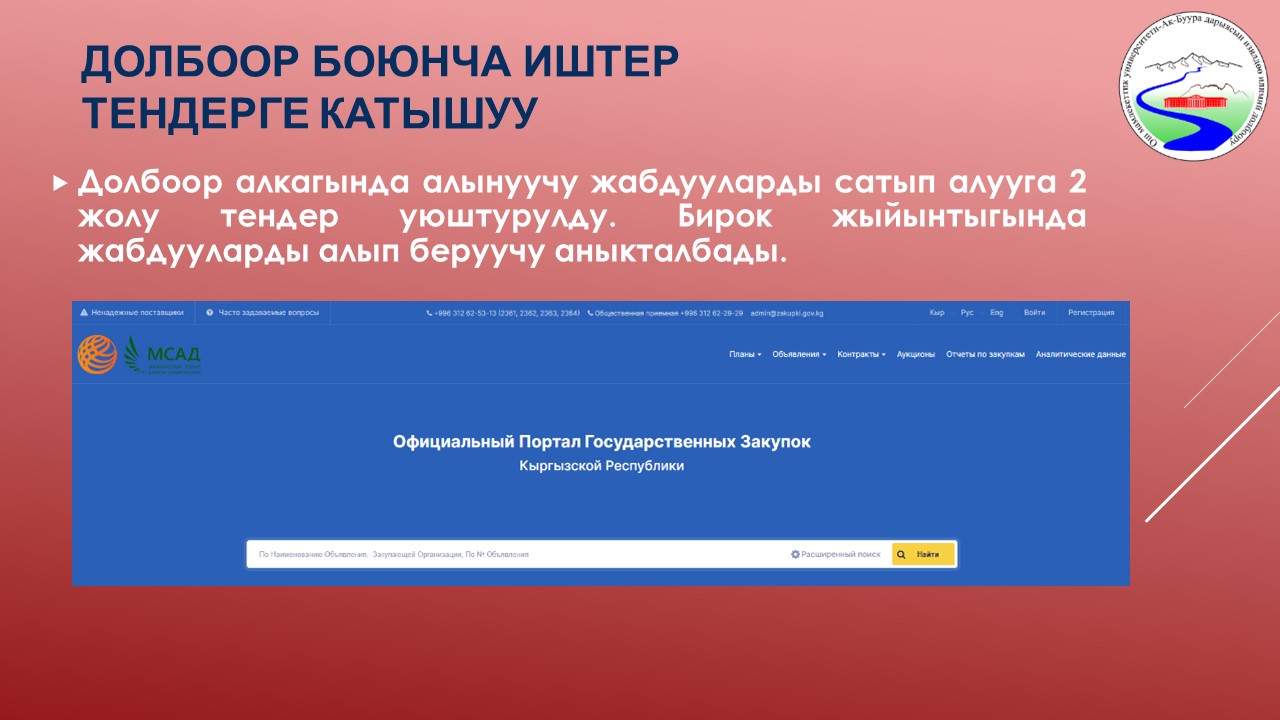 | 9 | Ак-Буура дарыясынын бассейнинин суу режиминин мониторинги жана комплекстүү географиялык-гидрологиялык райондоштуруу | 25-октябрь | 6. Долбоор алкагында сатып алынуучу жабдуулар боюнча 2 тендер откорулуп, женуучу аныкталбады. Учурда жабдуулардын тизмеси кайрадан каралып чыгып, баалар озгорулгонуно байланыштуу, эсептер ондолуп, 3-тендерге сунуштоо беруу боюнча иштер журуп жатат. | 2023-10-25  0000-00-00  |