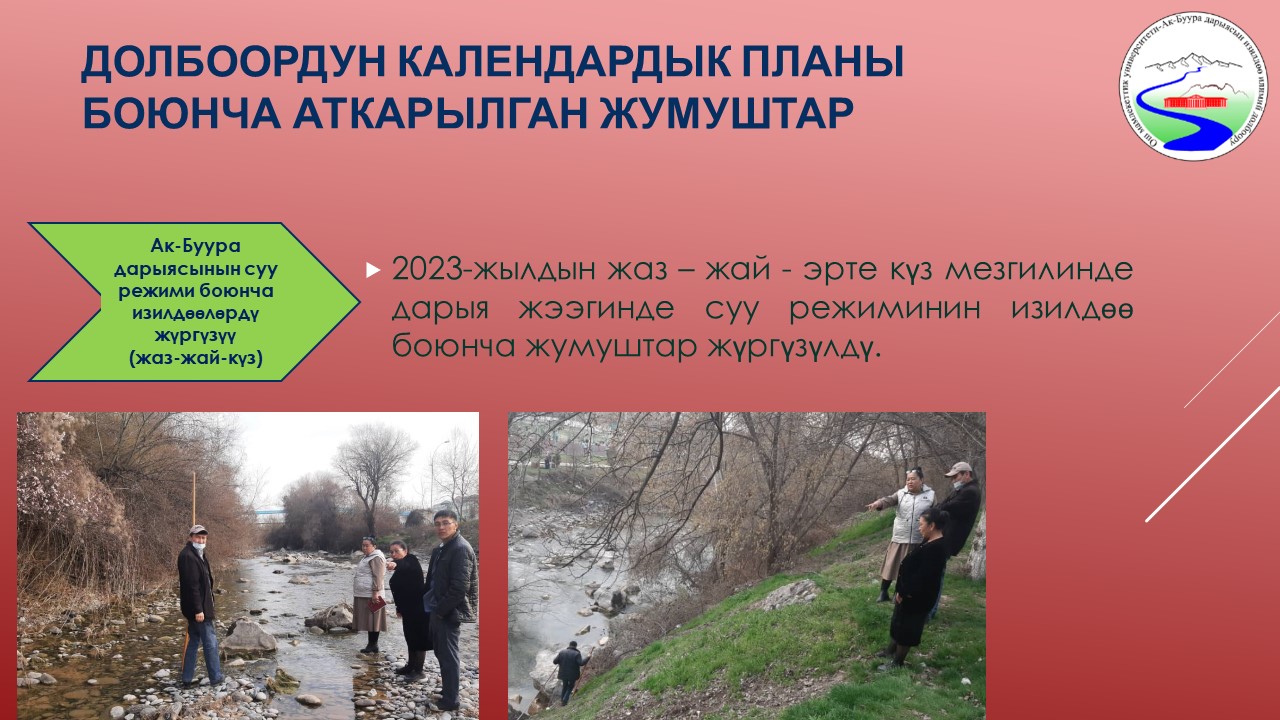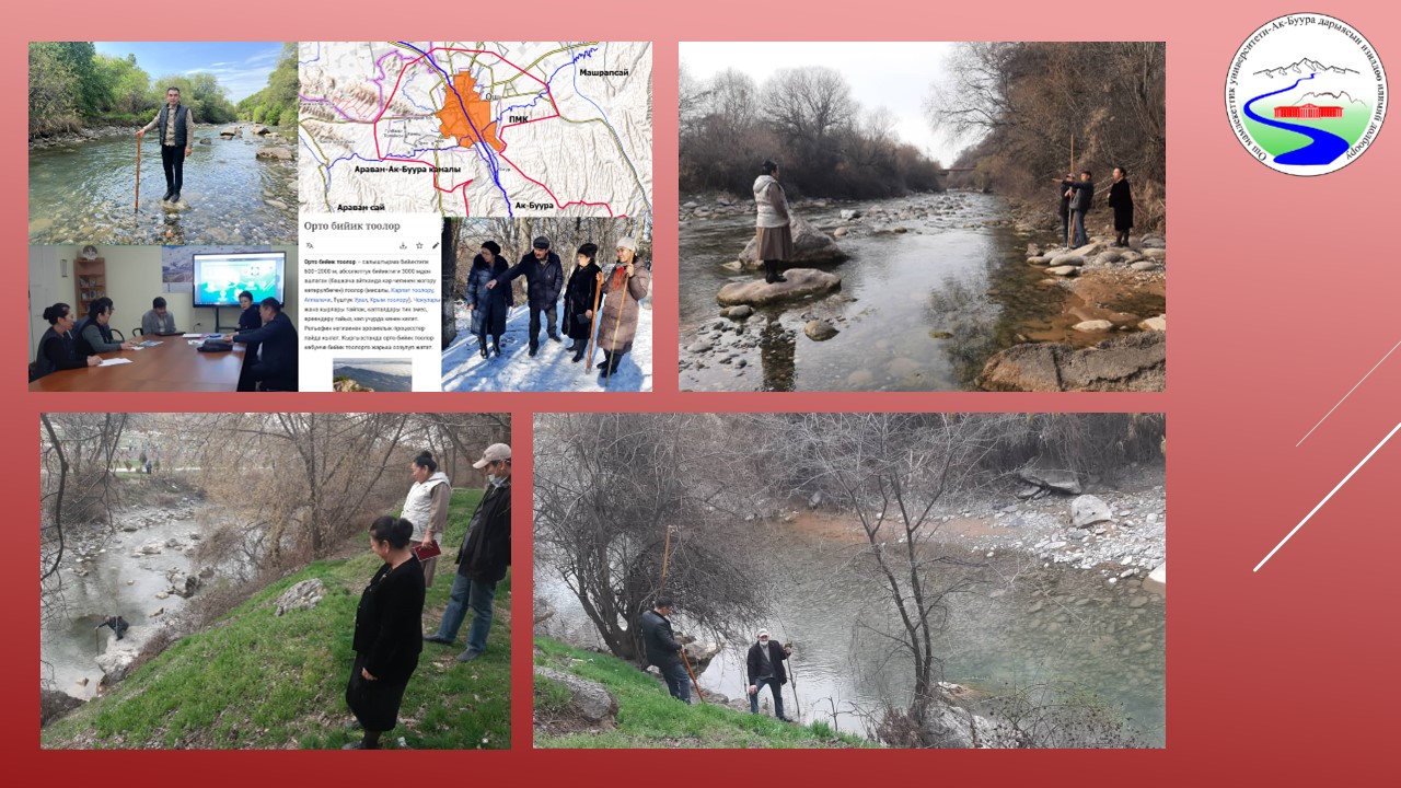 | 5 | Ак-Буура дарыясынын бассейнинин суу режиминин мониторинги жана комплекстүү географиялык-гидрологиялык райондоштуруу | 25-октябрь | 2. Факультеттин тушундагы Ак-Буура дарыясынын жээгинен бир нече жер каралып, суу ченоочу пунктту куруу орду тандалды. | 2023-10-25  0000-00-00  |