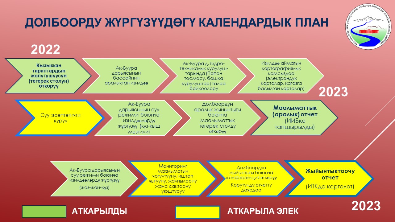 | 19 | Ак-Буура дарыясынын бассейнинин суу режиминин мониторинги жана комплекстүү географиялык-гидрологиялык райондоштуруу | Кызыккан тараптардын жолугушуусун (тегерек столун) өткөрүү | тегерек стол | 2022-01-09  0000-00-00  |