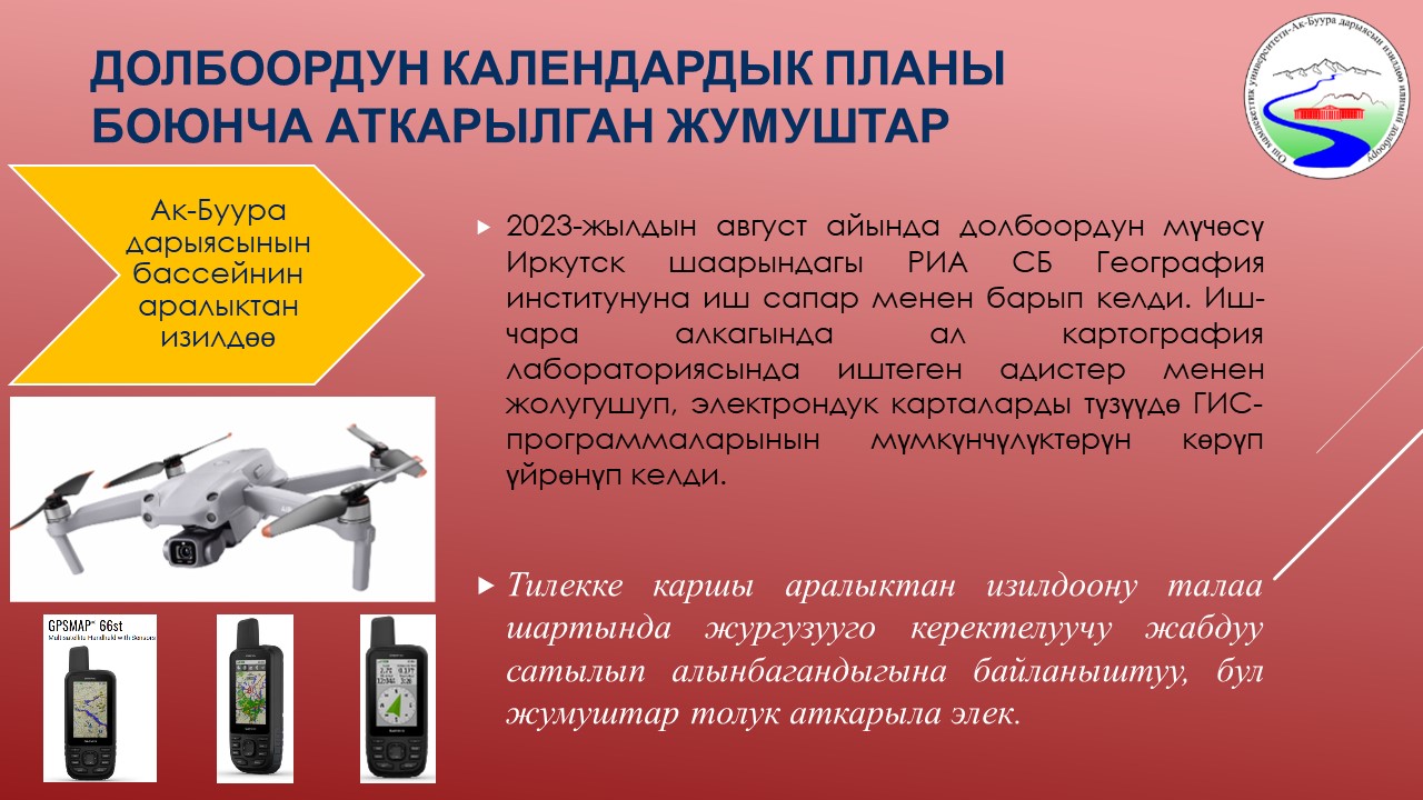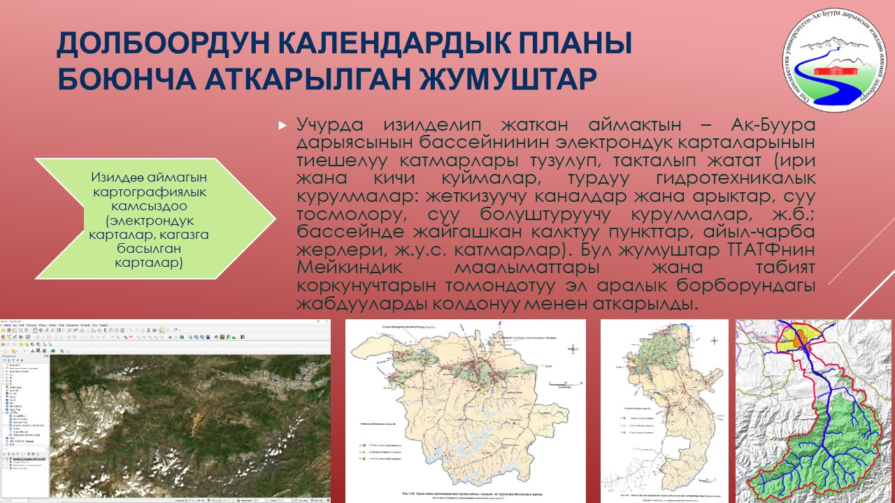 | 7 | Ак-Буура дарыясынын бассейнинин суу режиминин мониторинги жана комплекстүү географиялык-гидрологиялык райондоштуруу | 25-октябрь | 4. Геомаалыматтык системалар программалары жана спутниктик суротторду талдоо ыкмалары менен Ак-Буура дарыясынын бассейнин тактоо жургузулду. Учурда бассейди бийиктик боюнча (0-800м, 800-2000м, 2000-3500м, 3500м жогору) райондоо иши жургузулуп жатат жана т | 2023-10-25  0000-00-00  |