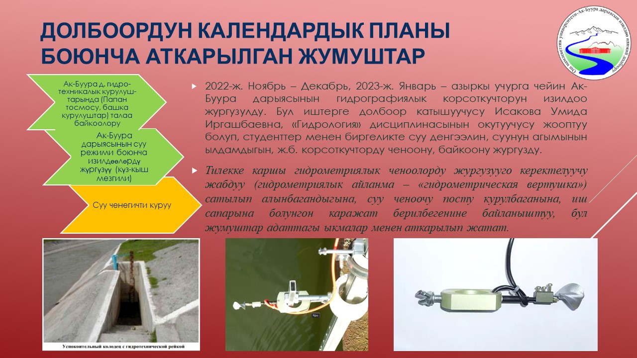 | 6 | Ак-Буура дарыясынын бассейнинин суу режиминин мониторинги жана комплекстүү географиялык-гидрологиялык райондоштуруу | 25-октябрь | 3. Студент жана магистранттар менен сабак, сабактан кийинки учурда Ак-Буура дарыясындагы суу денгээли, суу агымынын ылдамдыгы ченелип, суу колому гидрологиялык формулалар менен эсептелип турду. | 2023-10-25  0000-00-00  |