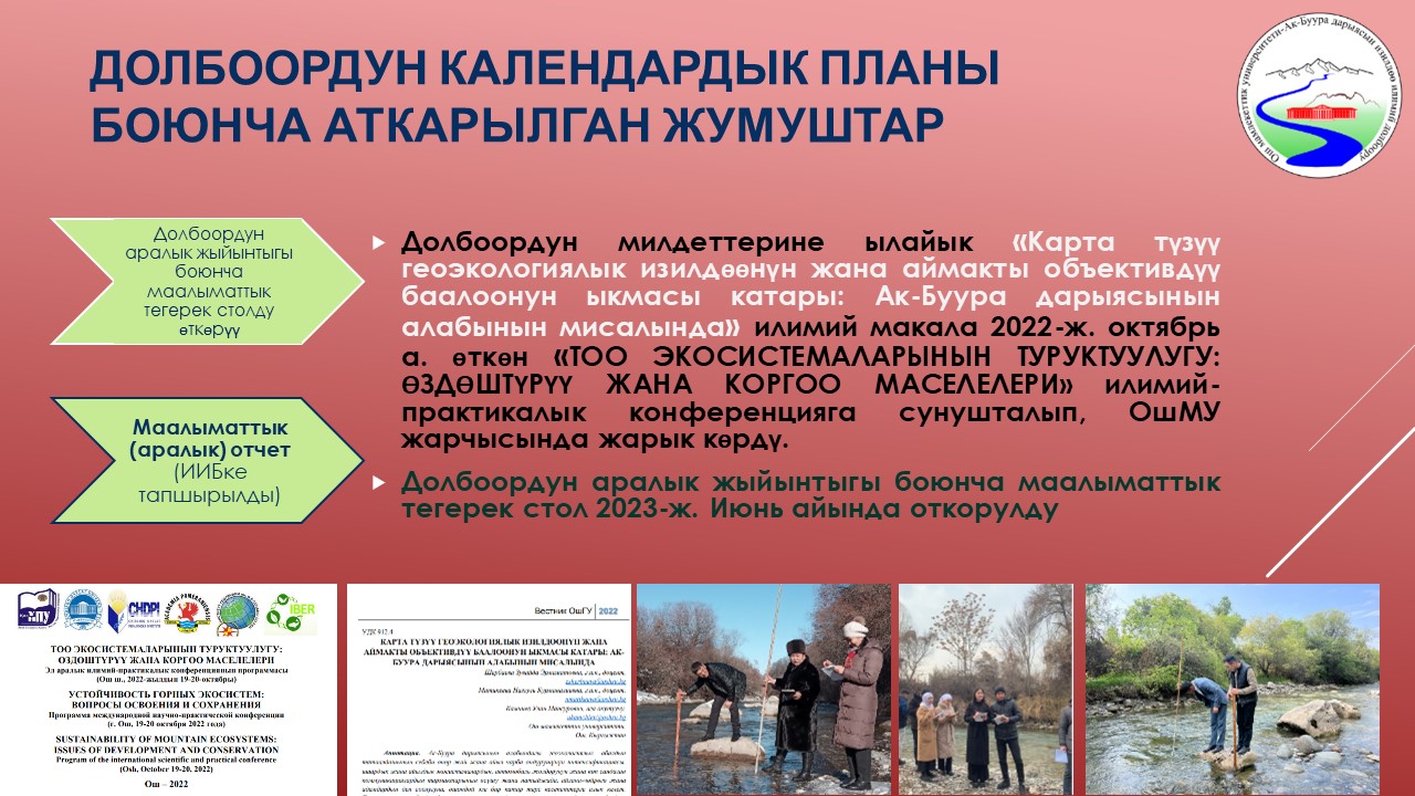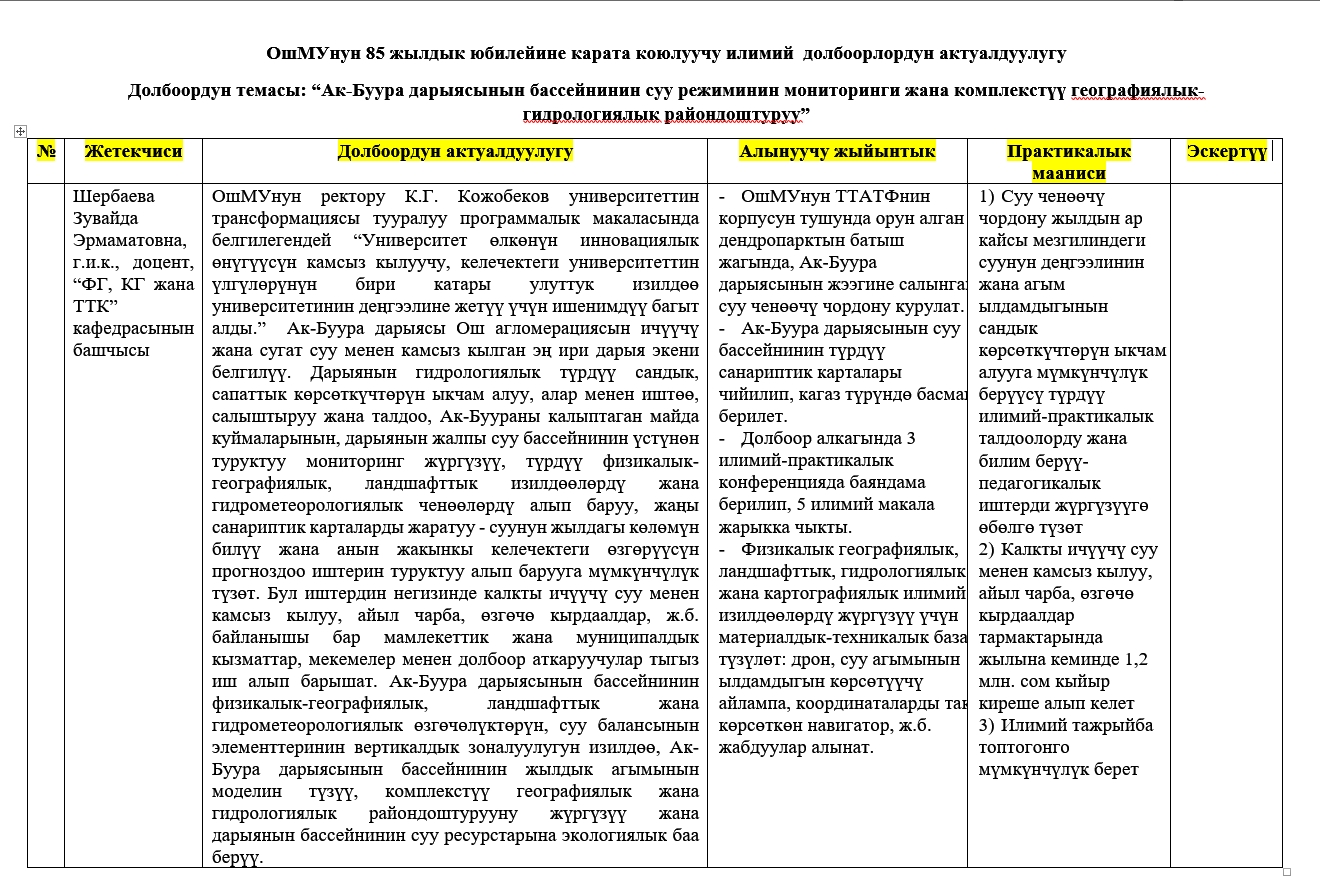 | 8 | Ак-Буура дарыясынын бассейнинин суу режиминин мониторинги жана комплекстүү географиялык-гидрологиялык райондоштуруу | 25-октябрь | 5. Долбоор иштеп чыккан топтун мучолору 2022-жылдын июнь айынан бери томонку макалаларды илимий журналдарга тапшырып, алар басмадан чыгарылды: | 2023-10-25  0000-00-00  |