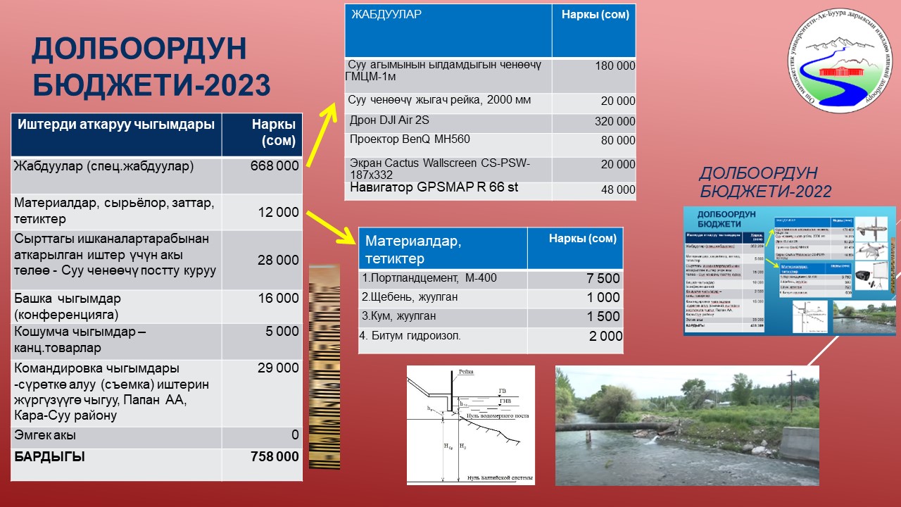 | 4 | Ак-Буура дарыясынын бассейнинин суу режиминин мониторинги жана комплекстүү географиялык-гидрологиялык райондоштуруу | 25-октябрь | Толуктоо - Жылдык отчет/ 1. Суу ченоо пункттун турдуу тузулуштору каралып чыгып, алардын ичинен долбоор милдеттерине эн эле ынгайлуусу тандалды. Курулманын чиймеси чийилип, материалдар жана жумуштар эсептелип чыкты. | 2023-10-25  0000-00-00  |