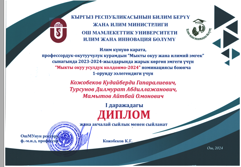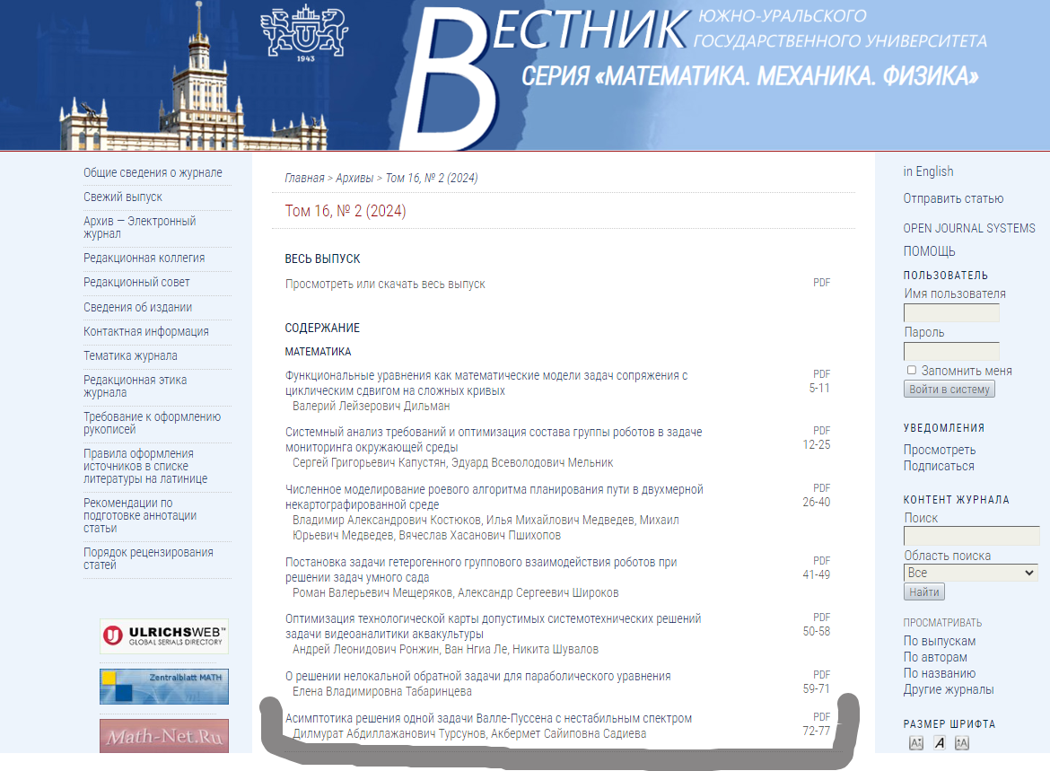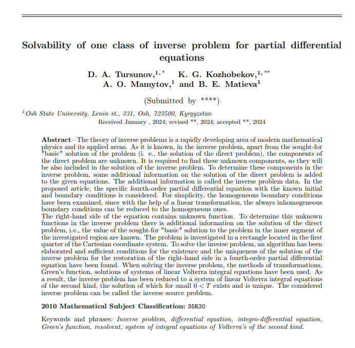 ОшМУ ЭАББПЖМ | Китеп 1.КР Билим берүү жана илим министрлигинин грифи меyен окуу колдонмо: Математикалык логика жана Maple (авторлор: Кожобеков К.Г., Турсунов Д.А., Мамытов А.О.); ISBN 978-9967-18-934-8 2.Монография: Жогорку тартиптеги жекече туундулуу дифференциалдык жана интегро-дифференциалдык теңдемелердин бир классы үчүн тескери маселелер (авторлор: Кожобеков К.Г., Турсунов Д.А., Мамытов А.О.); ISBN 978-9967-18-936-2 3) Окуу колдонмо: Дифференциалдык теңдемелер (авторлор: Турсунов Д.А., Садиева А.С.) ISBN 978-9967-18-950-8 SCOPUS макалалар: 1) Tursunov, D.A., Kozhobekov, K.G., Mamytov, A.O., Matieva, B.E. Solvability of One Class of Inverse Problem for Partial Differential Equations // Lobachevskii Journal of Mathematics, 2024, 45(7), 3453–3462; https://link.springer.com/article/10.1134/S199508022460410 2) Tursunov, D.A., Sadieva, A.S., Kozhobekov, K.G., Tursunov, E.A. Asymptotics of the Solution of the Cauchy Problem with an Unstable Spectrum and Prolonging Loss of Stability // Lobachevskii Journal of Mathematics, 2024, 45(3), 1309–1317; https://link.springer.com/article/10.1134/S199508022460084 3) Zhusubaliyev, Z.T., Sopuev, U.A., Tursunov, D.A., Bushuev, D.A. Bifurcation Structure of the Periodically Forced Relay System // Mechanisms and Machine Science, 2024, 167 MMS, 116–124; https://link.springer.com/chapter/10.1007/978-3-031-67569-0_1 РИНЦ макалалар 1) Турсунов Д.А., Садиева А.С. Асимптотика решения одной задачи Валле-Пуссена с нестабильным спектром // Вестник Южно-Уральского государственного университета. Серия: Математика. Механика. Физика. 2024. Т. 16. № 2. С. 72-77. https://cyberleninka.ru/article/n/asimptotika-resheniya-odnoy-zadachi-valle-pussena-s-nestabilnym 2) Турсунов Д.А., Бекмурза уулу Ы. Асимптотика решения двухточечной краевой задачи с особыми точками // Бюллетень науки и практики. 2024. Т. 10. № 8. С. 20-26. https://journal.oshsu.kg/index.php/vestnik/article/view/115 3) Кудуев А.Ж., Турсунов Д.А., Аркабаев Н.К., Оморов А.О. Эрмиттин жаңы типтеги сплайн-вейвлеттери // Федералдык мамлекеттик бюджеттик жогорку билим беруу мекемеси | |