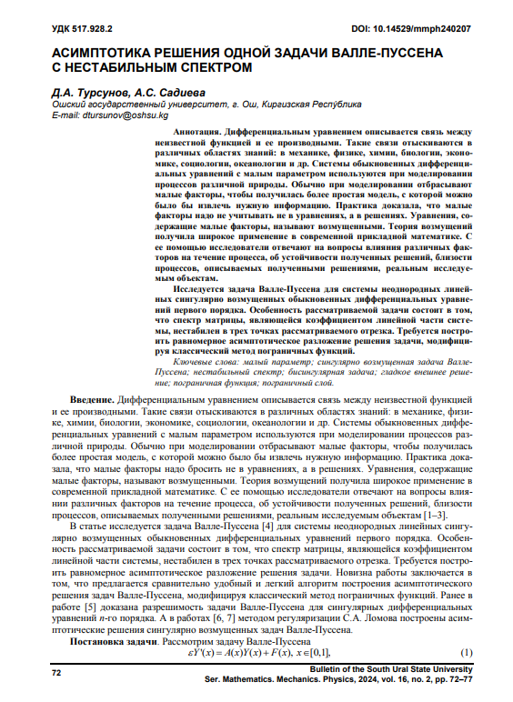 ОшМУ ЭАББПЖМ | 1) Бисингулярдык козголгон маселелерде үчүнчү зонанын пайда болушунун зарыл жана жетиштүү шарттары табылды. 2) Чыгарылыштын асимптотикасын тургузуу. 3) Scopus базасында эки макала жарыкка чыкты: (1. Bifurcation Structure of the Periodically Forced Relay System; 2. Asymptotics of the Solution of the Cauchy Problem with an Unstable Spectrum and Prolonging Loss of Stability) | |
