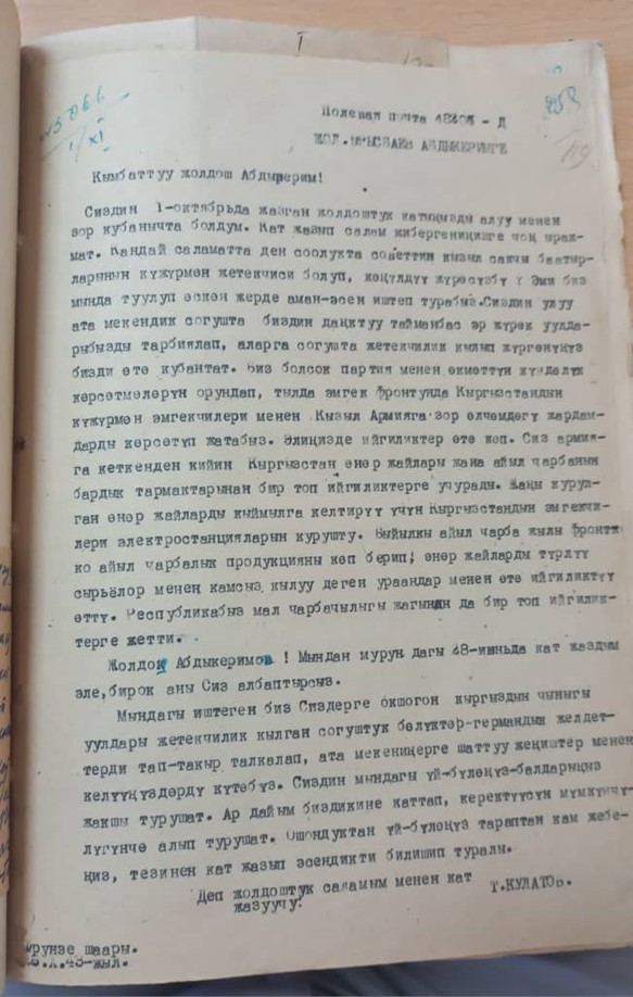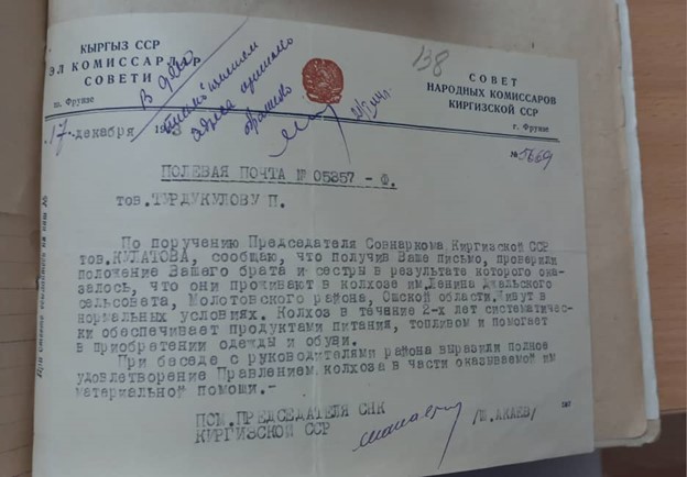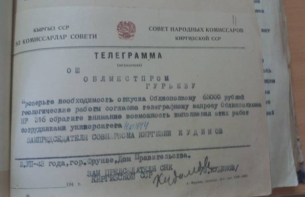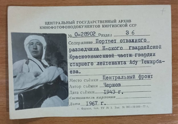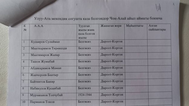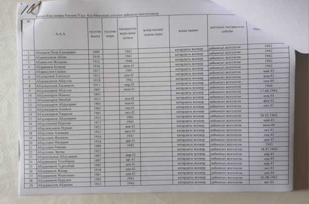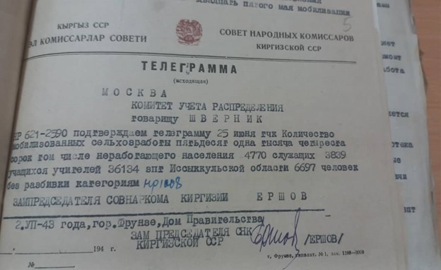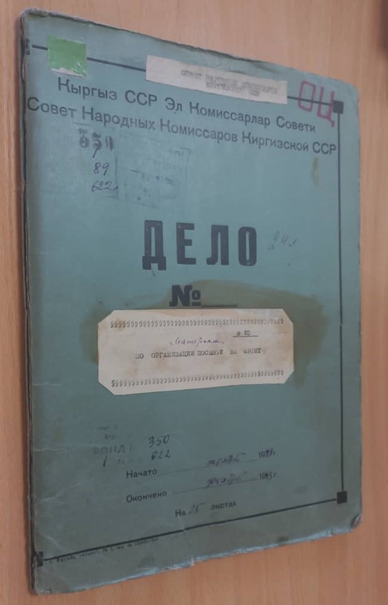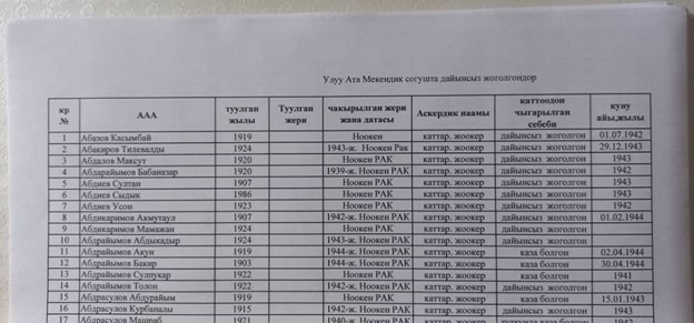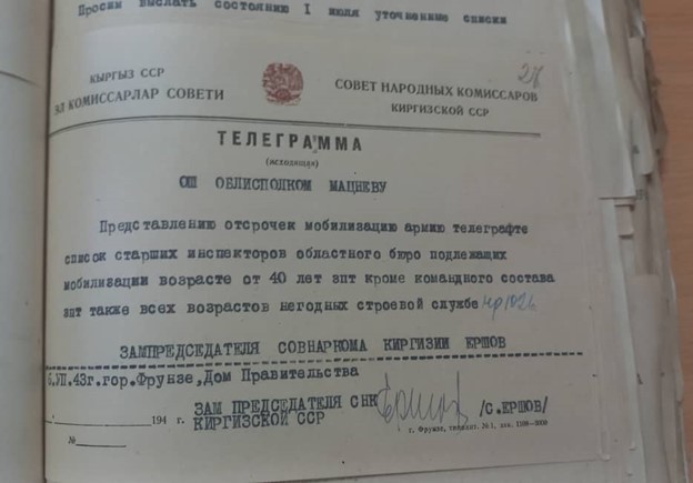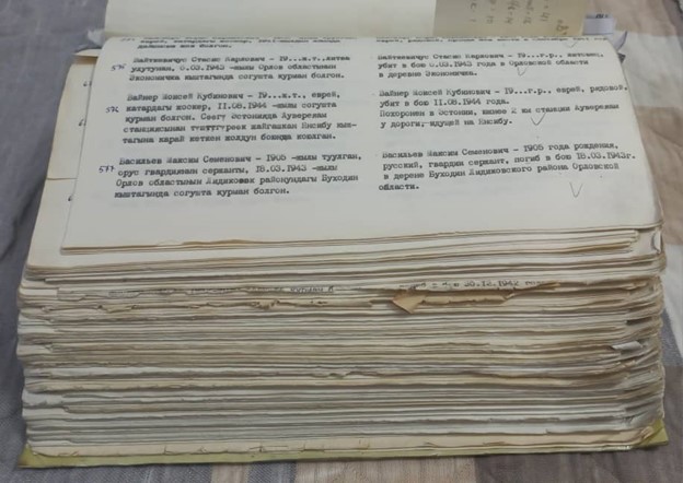 Бишкек шаарындагы Кыргыз Республикасынын Борбордук мамлекеттик архивинде жүргүзүлгөн илимий-изилдөө иштери | Июль айынан баштап Кыргыз Республикасынын Бишкек шаарындагы Борбордук мамлекеттик архивинде 1941-1945-жылдары Улуу Ата Мекендик согушка Кыргызстандан кеткен 360 000ден ашуу мекендештирибизди, 150 000ден айланасында кайтпай калган жана дайынсыз жоголгондорду изилдөө боюнча иштер жүргүзүлүп, алар жөнүндө маалыматтар топтолду, копиялары алынды. | |