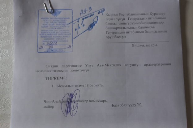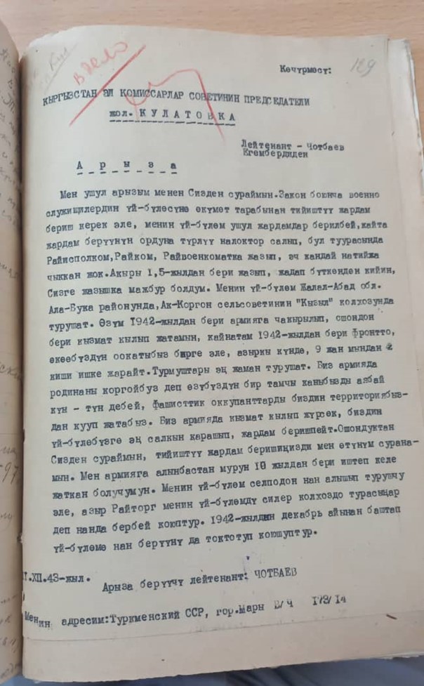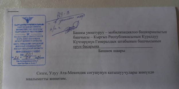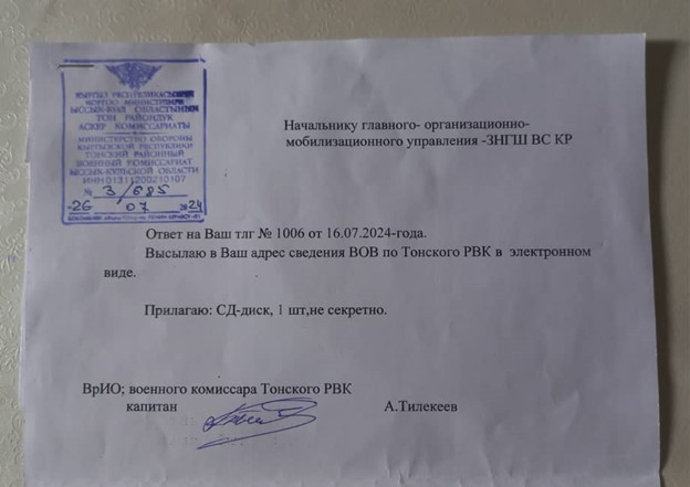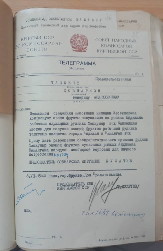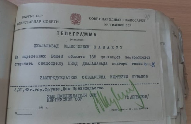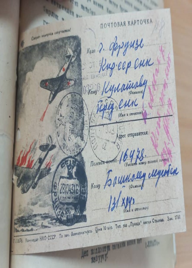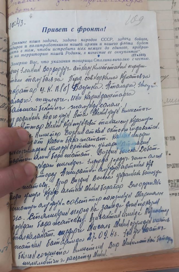 Бишкек шаарындагы Кыргыз Республикасынын Борбордук мамлекеттик архивинде жүргүзүлгөн илимий-изилдөө иштери | Июль айынан баштап Кыргыз Республикасынын Бишкек шаарындагы Борбордук мамлекеттик архивинде 1941-1945-жылдары Улуу Ата Мекендик согушка Кыргызстандан кеткен 360 000ден ашуу мекендештирибизди, 150 000ден айланасында кайтпай калган жана дайынсыз жоголгондорду изилдөө боюнча иштер жүргүзүлүп, алар жөнүндө маалыматтар топтолду, копиялары алынды. | |