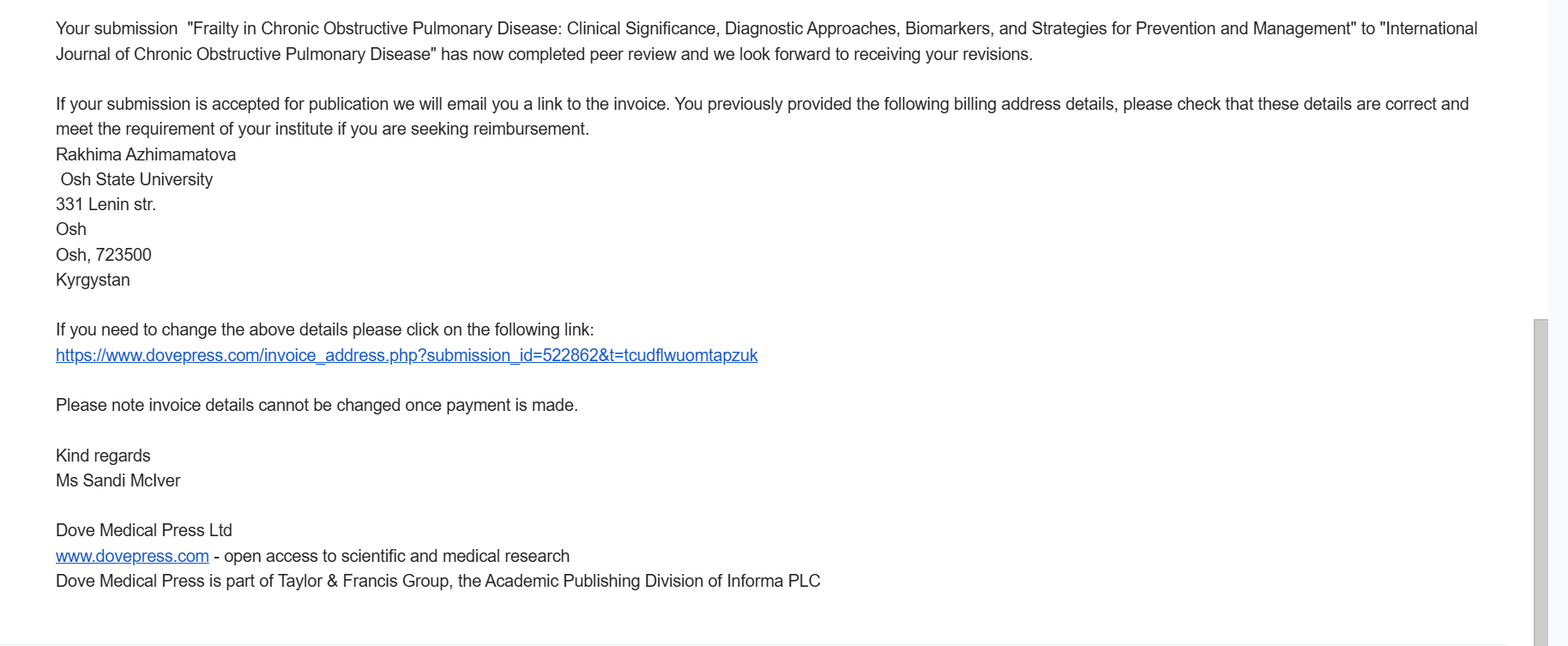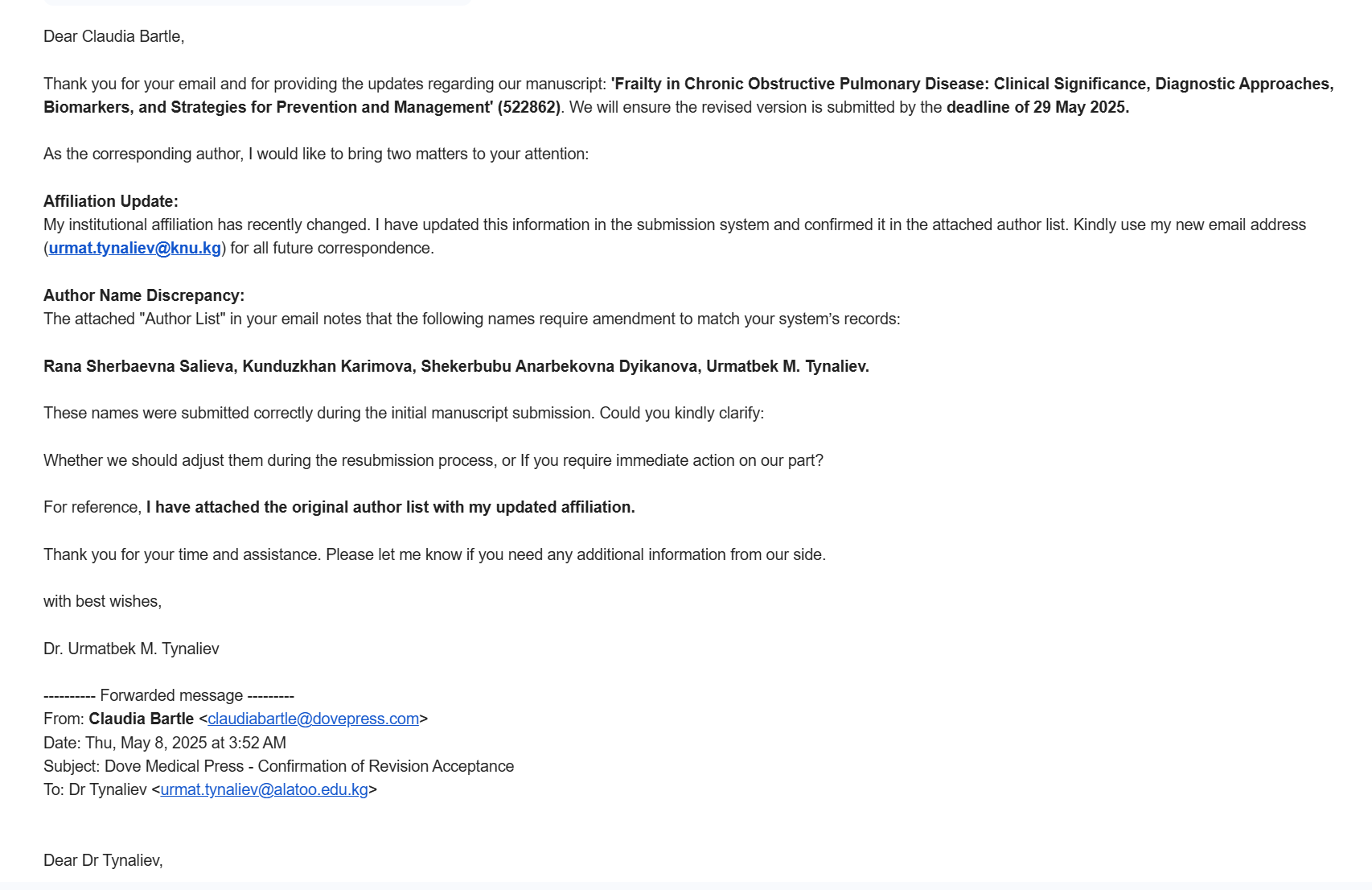 | 14 | "Frailty in COPD: Clinical Impact, Diagnosis, Biomarkers, and Management Strategies" аттуу илимий макала Scopus маалымат базасында индекстелген, жогорку импакт-факторлуу жана Q1 квартильге кирген "International Journal of Chronic Obstructive Pulmonary Dis | 2025-07-15 0000-00-00 |